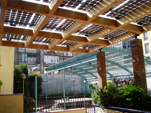 TTA carried out a 12 kWp PV installation project for a pergola in Basses de Sant Pere square, using glass-glass laminates that are semi-transparent in order to let some sunlight through.